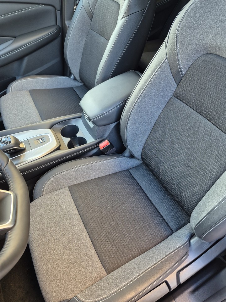 Černo-šedá látková sedadla s vsadkami ze syntetické kůže